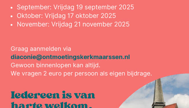 Aanmelden: diaconie@ontmoetingskerkmaarssen.nl maar binnenlopen mag altijd.